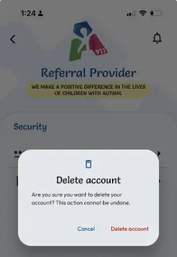 If you choose to delete your account, all associated data will be permanently removed from the Autism 911 Referral Provider platform.